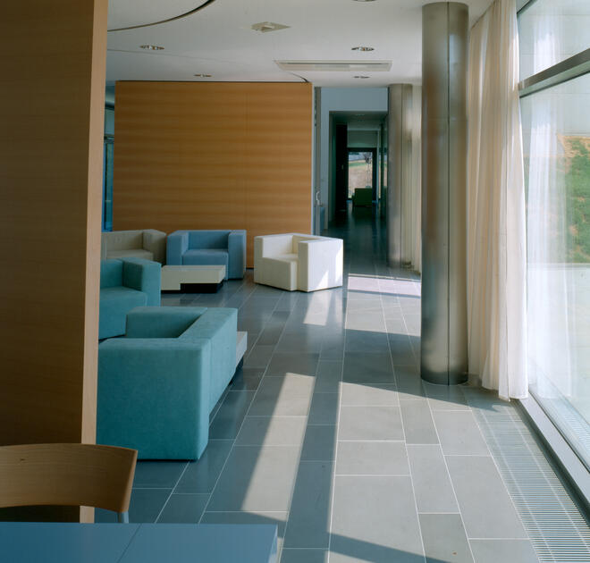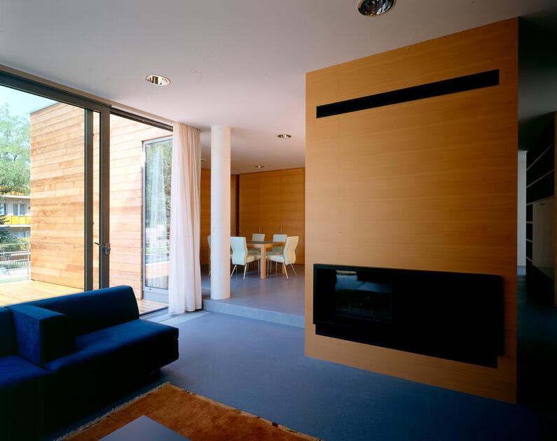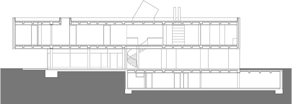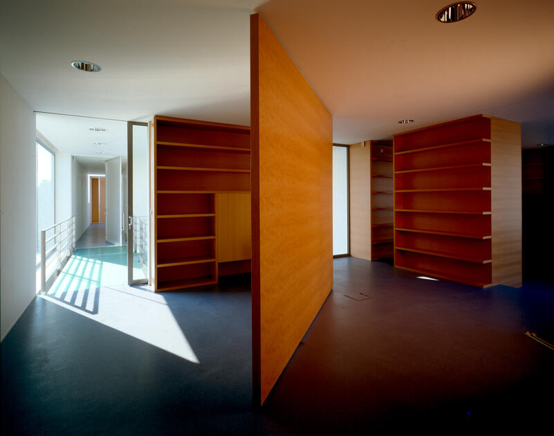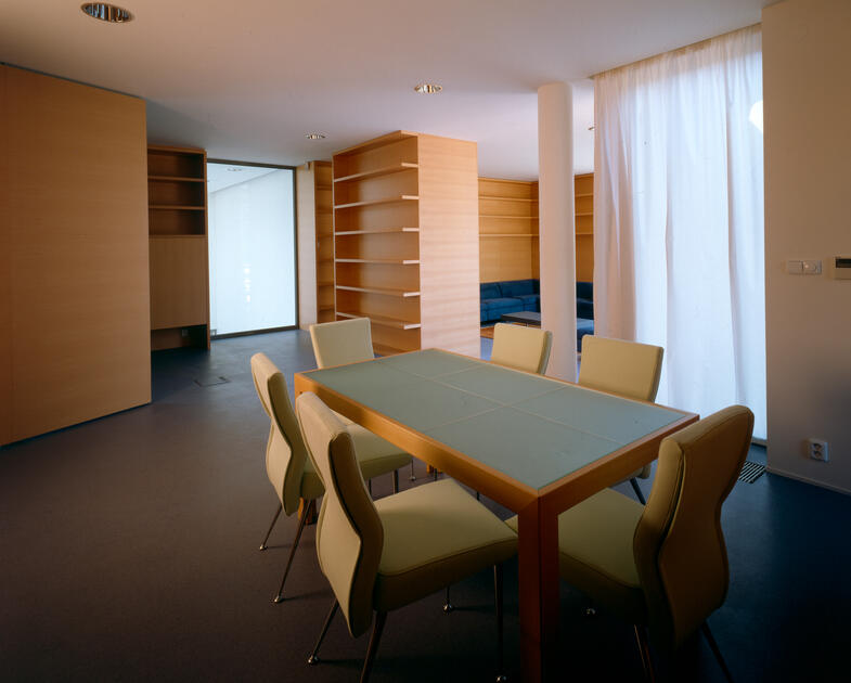 The structure consists of a reinforced concrete skeleton. A three-dimensional box structure renders the six-meter console above the representational spaces. The ambassador's apartment's prism has a wooden cladding of red cedar; it is used in combination with the visible concrete of the body and protruding parts and the transparent glazing of the representative part.