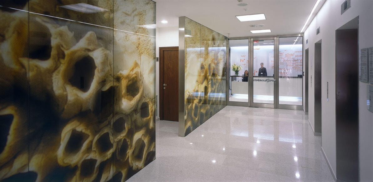 The architecture of the building is based on the design that received the 2nd prize in an international competition for the development of a plot. The façade supports the basic idea of a "watercolor" house. Glass with different print intensities creates surfaces with different transparency and creates an external effect that gives the house a unique character.