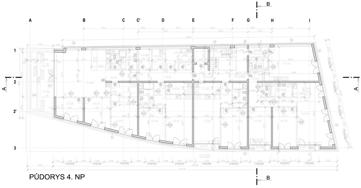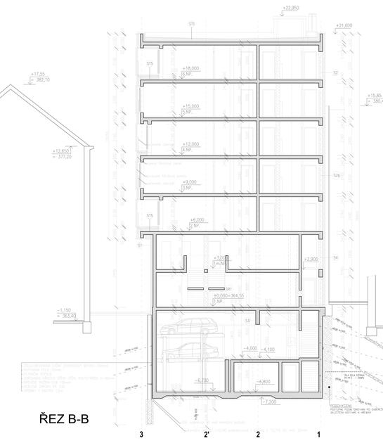 The basic visual character of the building is based on a regular grid of windows and loggias. The elementary grid of the windows is rhythmically disturbed by the overhanging layer of the facade in the stylized form of a volatile translucent veil. The overhanging facade consists of a combination of fixed and mobile shading panels. The purpose of movable panels in front of large-format windows to living rooms is to allow residents to regulate their own privacy and influence heat gains.