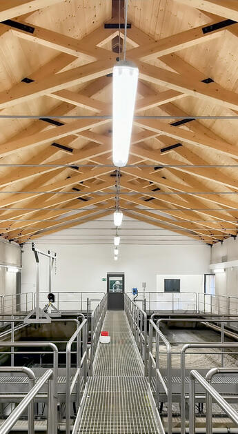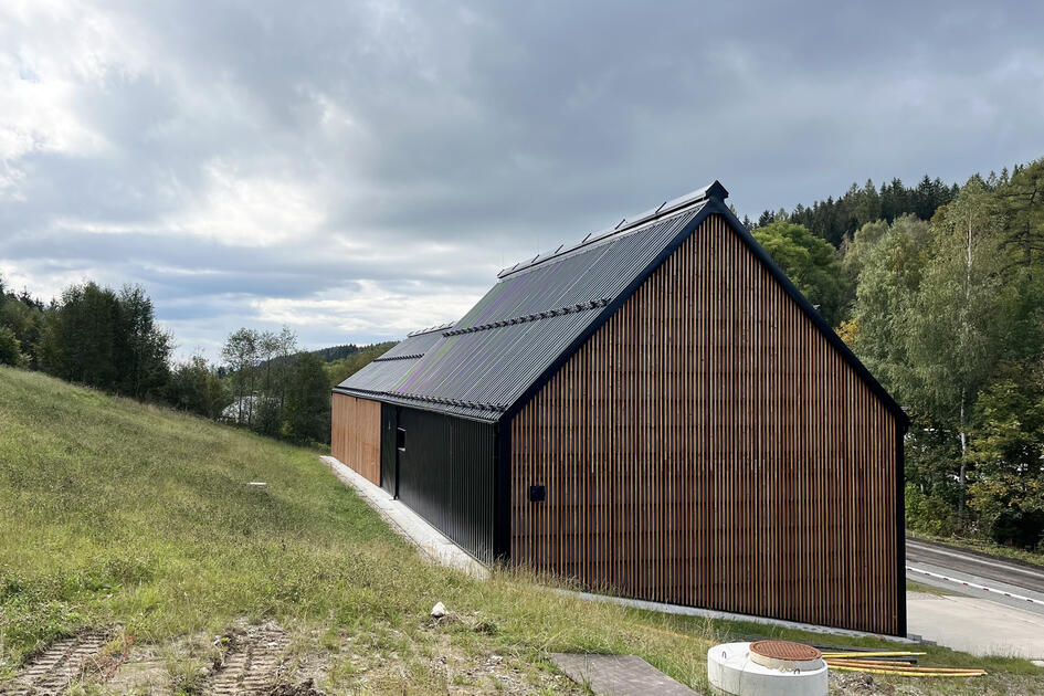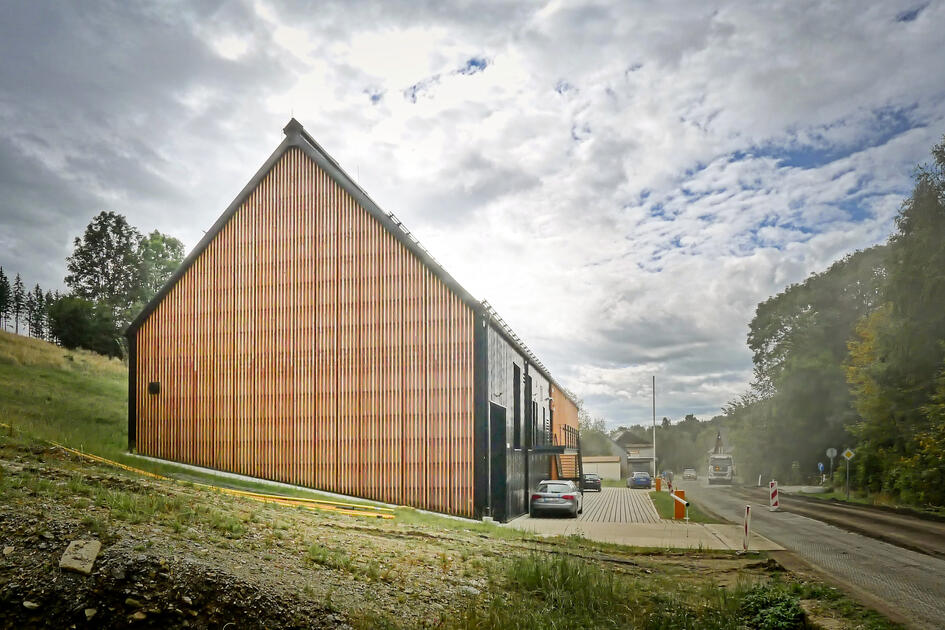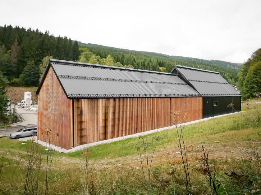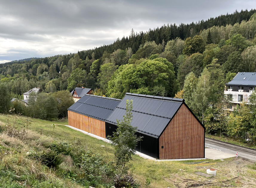 Prostorově je objekt řešen dlouhým obdélníkovým půdorysem s vysokou sedlovou rovnoramennou střechou, vycházející z tradičního jesenického domu. Stavba je umístěna hřebenem střechy po vrstevnici, svou hmotou tedy sleduje prudký svažitý terén, do kterého je z velké části zahloubena. Fasáda je z přírodních dřevěných lamel a černého trapézového plechu.