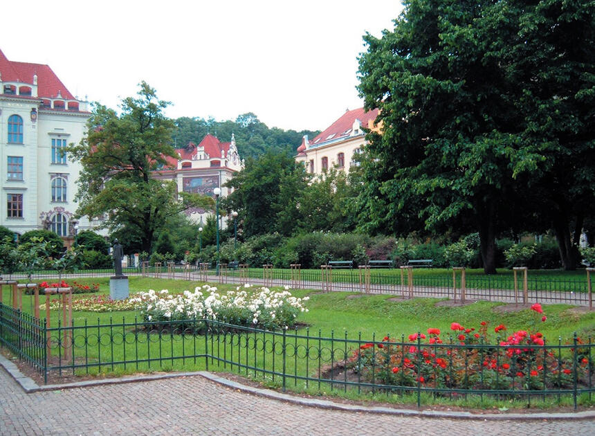 Původní osová kompozice je zdůrazněna dosadbami převislých buků, pyramidálních habrů a jilmů, obnovou lemujícího keřového patra i snížením středové plochy s okrasným oplůtkem, kruhovými záhony a řadami skalníků na kmínku. Stávající lemující stromořadí byla doplněna před secesní fasádu školy i na protilehlou stranu náměstí kulovitými javory a sakurami tak, aby průhled zůstal zachován. Součástí parku je drobná plastika.